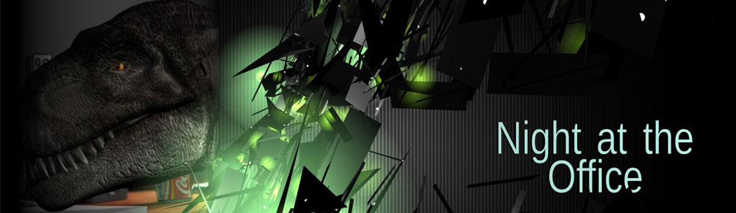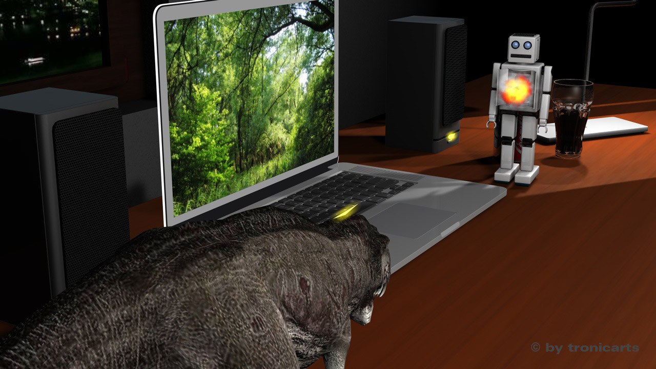 Animation eines T-Rex, der aus einem Laptop entweicht und beginnt den Schreibtisch zu verwüsten. Zum Glück passt jemand auf und verhindert eine weitere Eskalation.